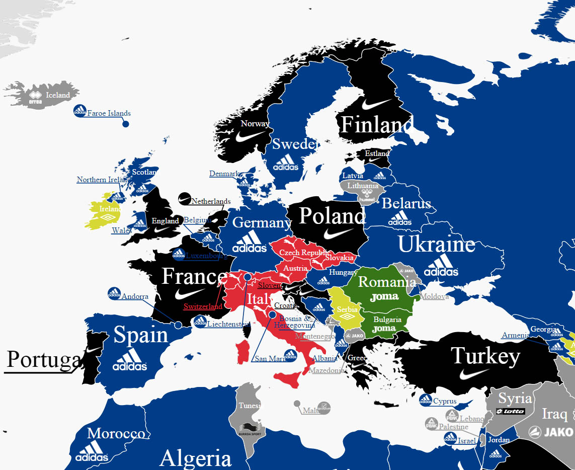 Relativ leicht erkennbar sind die beiden dominierenden Marken Adidas (blau) und Nike (schwarz). Neben den klassischen Nationen wie der USA oder Brasilien ist Nike speziell auf dem asiatischen Markt stark vertreten. Adidas hingegen punktet neben den gewohnten Partnern wie Spanien oder Deutschland derzeit vor allem im nordafrikanischen Raum.